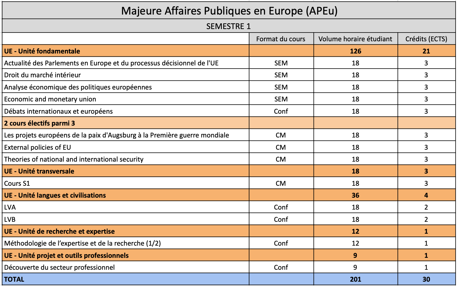 Formation concrète et professionnalisante, la majeure APEu se démarque par un grand nombre de cours dispensés par des intervenants extérieurs. Cette approche permet aux étudiantes et aux étudiants de découvrir des métiers propres aux institutions européennes et les concours de la fonction publique européenne.